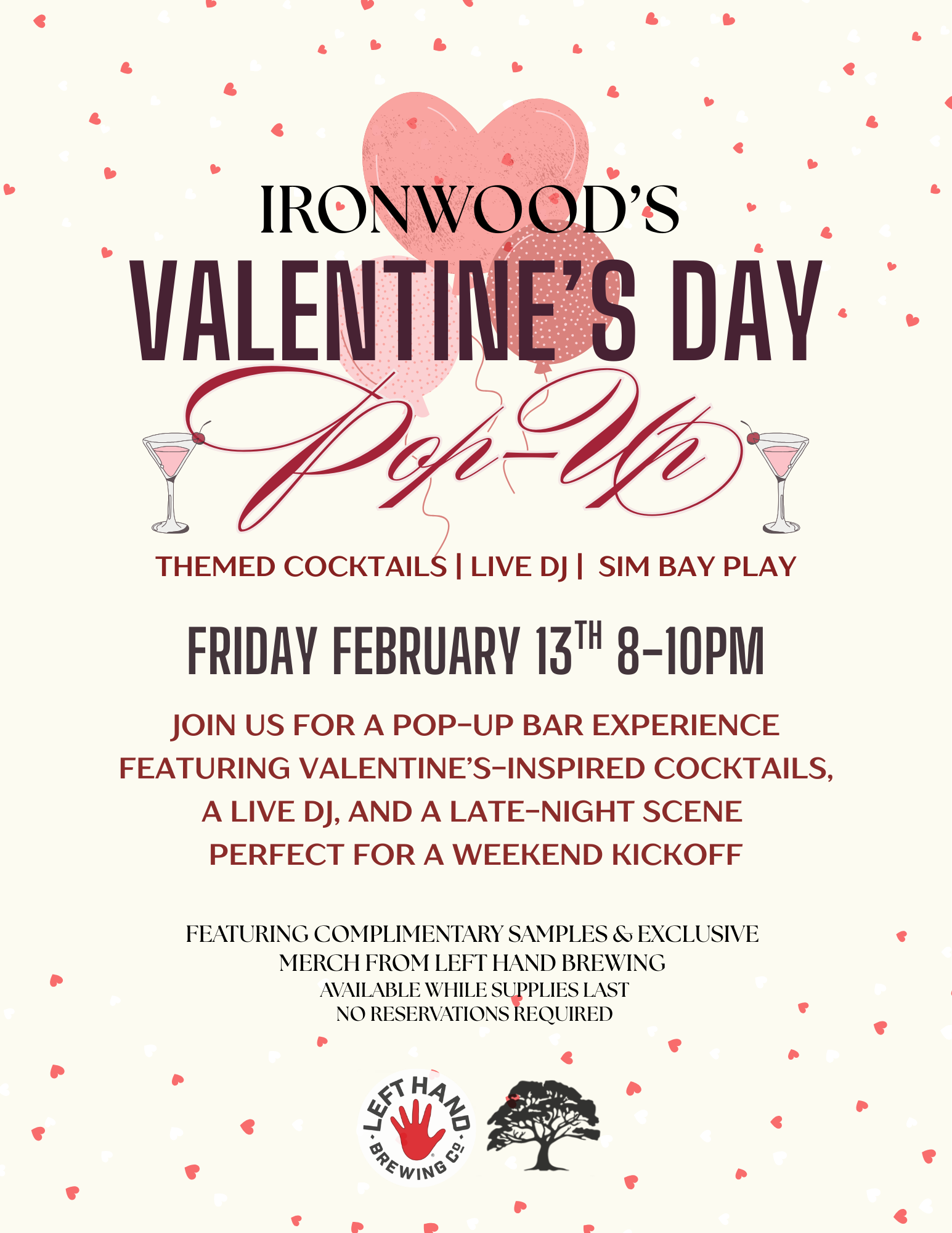 Join us for a Valentine's Pop-Up Bar experience featuring Valentines- inspired special cocktails, a live DJ, and a late-night scene perfect for a weekend kick off! Our event sponsor Left Hand Brewing will offer complimentary samples and giveaways!