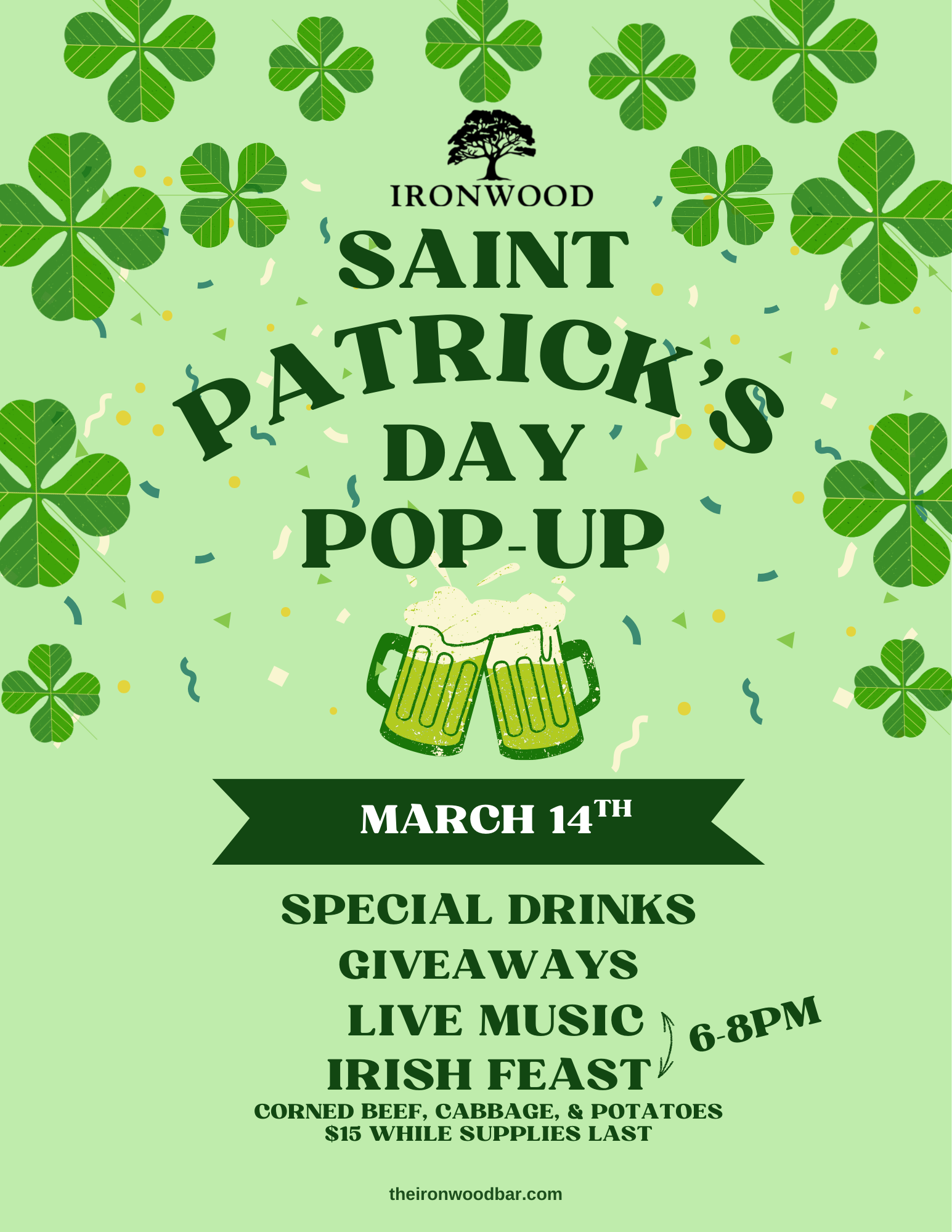 We are bringing back LIVE MUSIC along with Guinness swag, Tullamore swag, drink specials, and a special food spread to compliment our over-the-top bar decorations for a spring themed blowout! Join us for: